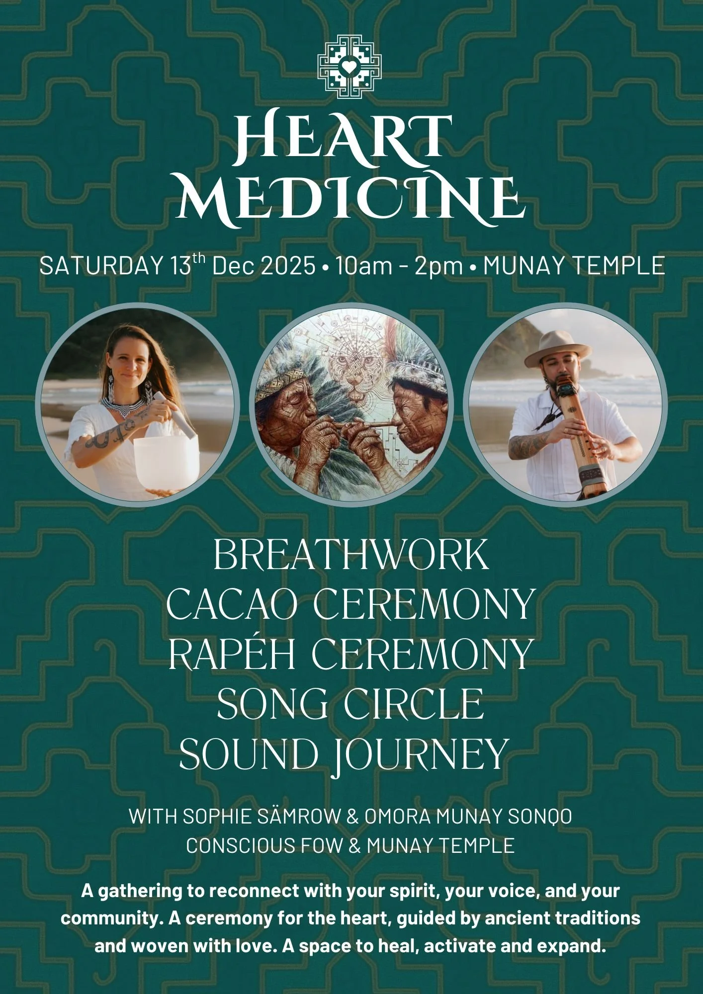 Join us Sunday, 11 January 2026, at Munay Temple, Newrybar, for a healing day of sisterhood and transformation. Led by Sophie Sämrow, experience breathwork, rapé, cacao, sound healing, fire ceremony, and song circle.